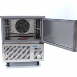 Når du har lagt maden i denne professionelle blæstkøler, begynder den at køle af. Inden for 90 minutter kan maden køles ned til 3°C, og på cirka fire timer kan den køles yderligere ned og fryses til -18°C. Den ønskede temperatur kan indstilles ved hjælp af den intelligente digitale temperaturregulator. Denne blæstkøler har også et termometer i kernen og kan bruges i miljøer med en maksimal omgivelsestemperatur på 32°C. Den leveres også på hjul, hvilket gør det nemt at transportere denne topmodel. Den er udstyret med en selvlukkende dør med en antibakteriel gummitætning, og alle hjørner på indersiden af blæstkøleren er afrundede, hvilket gør den nem at rengøre. Kølesystemet består af en vandfordamper, og det anvendte kølemiddel er R290, som er CFC-frit. Denne blæstkøler er også udstyret med en automatisk afrimningsfunktion.