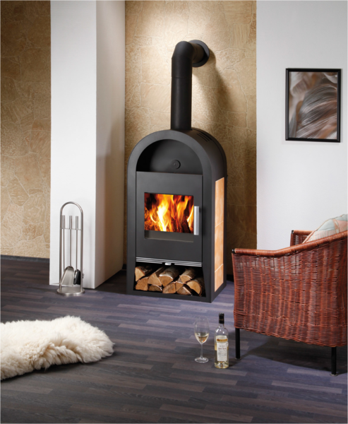 Kaminofen mit Wärmetauscher, Platz für Holz, Heizelement und beigefarbenen Fliesen, HAAS+SOHN, NIVALA