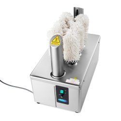 This glass polisher has a total of eight brushes. There are six large ones on the outside and two small ones in the middle for the inside of the glass. The polisher works best when used on glass that has already been washed but is still wet. To make sure that every spot is perfectly polished, simply tilt the glass slightly against the brushes. To dry the glass completely, hold it horizontally with the opening facing the fans. To keep the polished glass free of fingerprints and smudges, it is best to use rubber gloves. The brushes can be removed for easy cleaning without the use of tools.