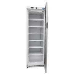 This professional freezer has a total capacity of 400 l for storing frozen products. This white freezer will fit easily into most professional kitchens. It is equipped with six fixed shelves that provide ample storage space. The shelves are designed in a grid pattern that improves ventilation. The glass door is equipped with a lock that allows you to view frozen products without having to open the refrigerator.
