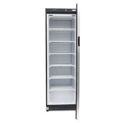This professional freezer has a total capacity of 400 l for storing frozen products. This black freezer fits easily into most professional kitchens. It is equipped with six fixed shelves that provide ample storage space. The shelves are designed in a grid pattern that improves ventilation. The glass door is equipped with a lock that allows you to view frozen products without having to open the refrigerator.