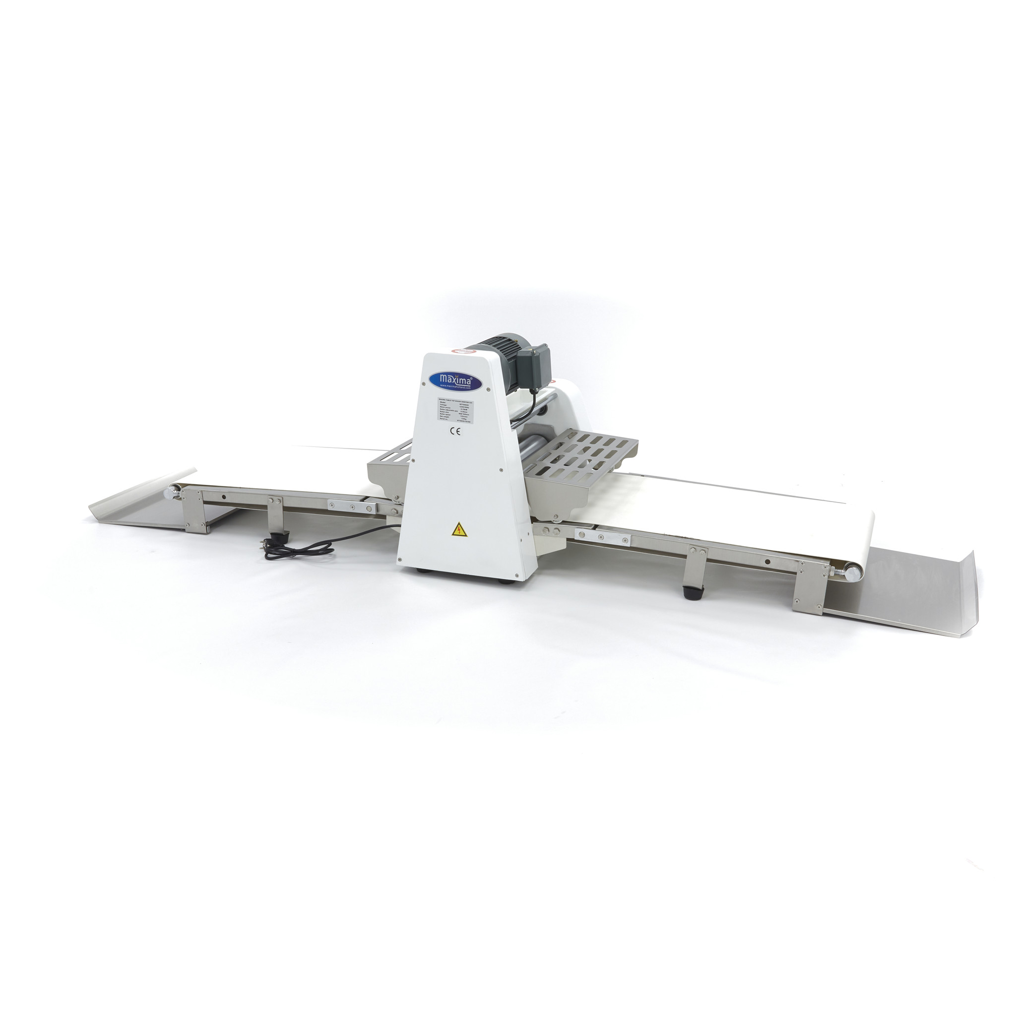 Thanks to the practical conveyor belt made especially for food processing, you can process large portions of dough. The roller is very user-friendly and has a flour container at the top. This prevents the dough from sticking to the conveyor belt and roller. Use the upper handle to set the correct dough thickness. With this lever, you can select a thickness between 0 and 35 mm. Once you have placed the dough on the conveyor belt, use the lower handle to pass the dough through the roller. On the other side of the roller, the dough will come out evenly rolled out.