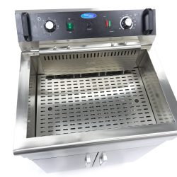 Ez a sokoldalú fritőz extra nagy, így nagyobb mennyiségű ételt is készíthet vele. Ideális akár 3 kg hasábburgonya sütéséhez egy 30 literes olajkapacitású fritőzben. Nagy adag sült halat, zöldséges snackeket, churrost és egyéb sült ételeket is képes kezelni anélkül, hogy a vásárlóknak sokat kellene várniuk a rendelésükre. Az alsó szekrény két rozsdamentes acél ajtóval van felszerelve, fogantyúkkal. Az ajtóba beépített leeresztő csap található a gyors olajcseréhez. Tárolóhelyként is szolgál további olajos palackok számára. A fritőz levehető fedéllel rendelkezik, amely megakadályozza az olaj kifröccsenését, a fogantyúk pedig hőállóak. A mellékelt rácsot is felszerelheti a maradék zsír felfogására.