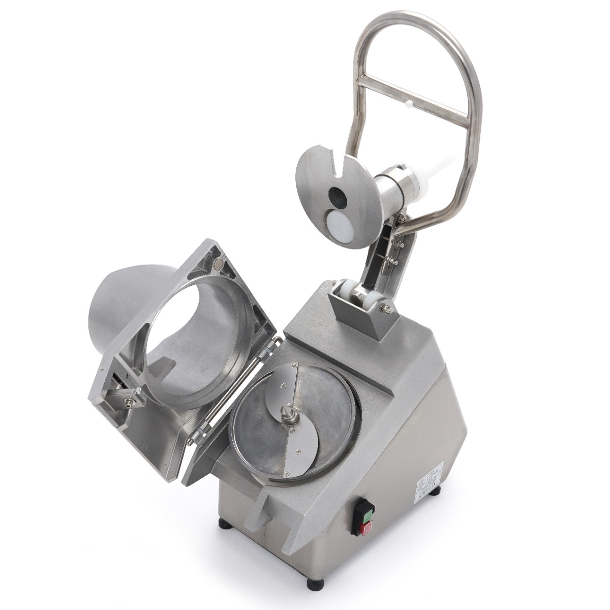 Inizia lavando la frutta e la verdura, se necessario. Seleziona con cura l'affettatrice desiderata e chiudi il coperchio. Collega l'apparecchio alla presa di corrente e premi il pulsante verde per avviare l'affettatrice. Solleva il manico e inserisci la frutta e la verdura nell'apertura rotonda. Spingi il manico verso il basso e usa il pulsante per guidare la frutta e la verdura verso i dischi per affettare. Il manico è dotato di un interruttore di sicurezza che arresta automaticamente la macchina quando si sposta il manico verso l'alto o verso il basso. Una volta terminato di affettare il cibo, premi il pulsante rosso per spegnere l'apparecchio. Con i diversi dischi da taglio inclusi in questa macchina, puoi tagliare quasi ogni alimento esattamente come desideri. Questa macchina include dischi da taglio da 5, 3 e 1,5 mm di diametro e grattugie da 3 e 5 mm di diametro. Altre affettatrici come affettatrici a julienne e griglie per patatine fritte sono disponibili anche sul nostro sito web (seleziona i dischi per affettare). VC750). Per preparare i cubetti, è necessario combinare la griglia per cubetti con un disco per affettare standard delle stesse dimensioni. Lo stesso vale per affettare le patatine fritte con il disco per patatine fritte.