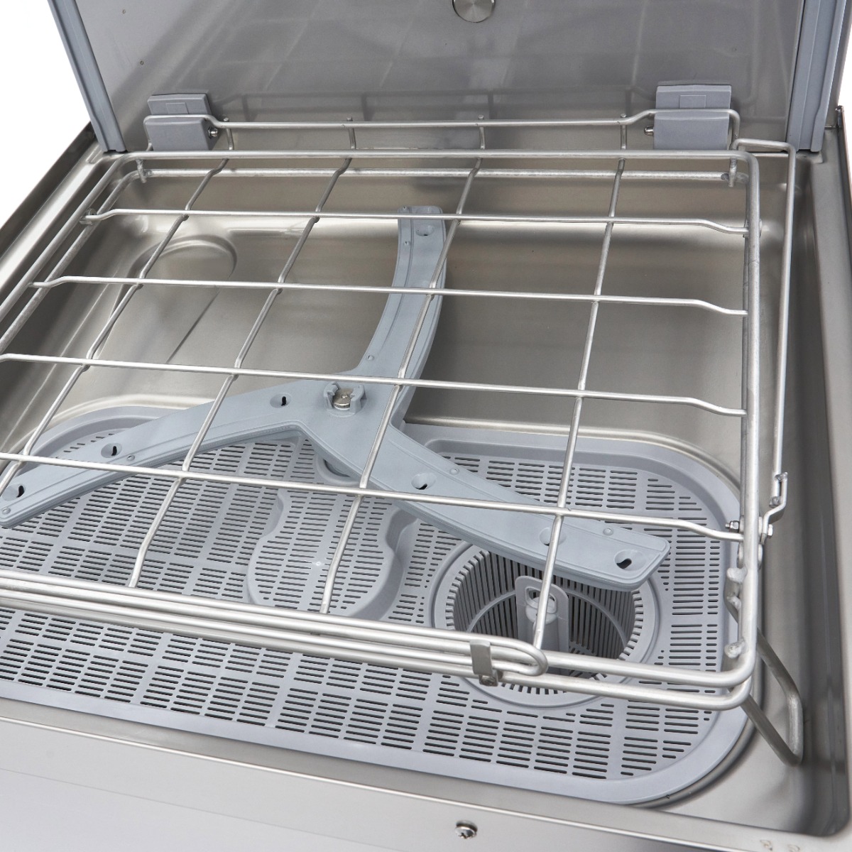 La lavastoviglie a cestello è realizzata interamente in acciaio inox, il che la rende molto facile e veloce da pulire. Le superfici lisce possono essere pulite con un panno umido. I bracci di lavaggio interni sono realizzati in ABS speciale e possono essere puliti con un panno e acqua. La lavastoviglie è dotata di pompe di risciacquo e di detersivo. È importante notare che le pompe di risciacquo e di detersivo accettano solo detersivo liquido. Non è inclusa alcuna pompa di scarico poiché l'acqua defluisce naturalmente.