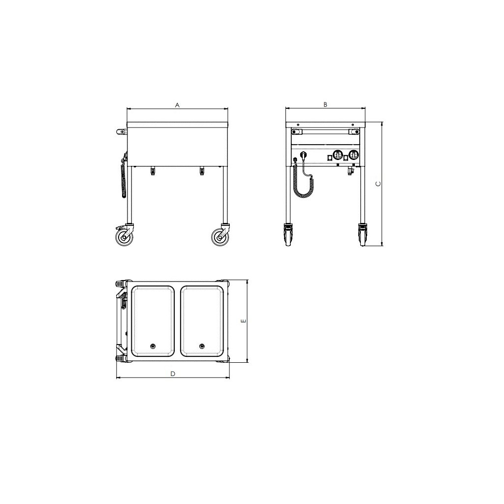 Výdejní elektrický udržovací stůl bez police, který je vhodný pro transport a výdej připraveného jídla v GN nádobách. Ovládání na krátké straně. Dvě nádoby. Varianta s topnými tělesy, která zajišťuje náhřev za cca 50 minut. Čtyř otočná kola o průměru 125 mm, z nichž dvě na přední straně jsou vybavená brzdou. Ergonomické a tepelně izolované madlo. Robustní, samonosné a hygienické provedení z vysoce kvalitní nerezové oceli. Plynule nastavitelná provozní teplota 30 – 95 °C. Každá z van může sloužit pro vložení nádoby GN 1/1-200. Vana se spádovaným dnem.