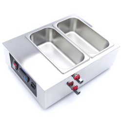Tento tavič čokolády je celý vyroben z nerezové oceli. Ta zabraňuje korozi a usnadňuje čištění tavičky čokolády. Spotřebič má nádržku na vodu, kterou je třeba před rozpouštěním čokolády naplnit. Dále je tento tavič čokolády vybaven 2 nádobami o velikosti 1/3 GN s hloubkou 10 cm a odpovídajícími víky. Ovládací panel je jednoduchý a skládá se z tlačítka zapnutí/vypnutí a digitálního displeje, který umožňuje nastavit teplotu pomocí šipek. Na boční straně tavičky čokolády jsou dva odtoky. Spodní odtok je kohoutek pro vypouštění vody. Ten umožňuje rychle vypustit vodu z tavičky čokolády bez rizika popálení rukou. Horní odtok je ventil pro vypouštění páry; tímto způsobem lze rychle vypustit vzniklou páru. Tím také zabráníte vzniku horkých výparů, když chcete ze spotřebiče vyjmout gastronádoby s čokoládou.