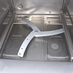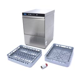 Com um consumo de água de 2,4 litros por ciclo, esta máquina de lavar louça é muito econômica. Graças à proteção térmica, também é segura para uso. O painel de controle possui proteção IPX4, impedindo a entrada de água atrás dos botões. Além disso, é fácil de usar: possui um botão liga/desliga, um segundo botão para iniciar/parar o ciclo de lavagem e um terceiro botão para selecionar o programa de lavagem desejado. Três luzes indicadoras também estão presentes. O visor indica quando a máquina de lavar louça está pronta para iniciar e quando o programa de enxágue está em andamento. A louça é lavada a 60 °C e enxaguada a 80 °C, secando rapidamente. Esta máquina de lavar louça vem com um cesto para copos de 50 x 60 cm, um cesto para pratos de 50 x 60 cm, um cesto para talheres e mangueiras de entrada e saída de água para conectar o aparelho à rede hidráulica. Esta máquina de lavar louça não inclui bomba de enxágue, sabão e drenagem, mas kits especiais podem ser encomendados pelo site.