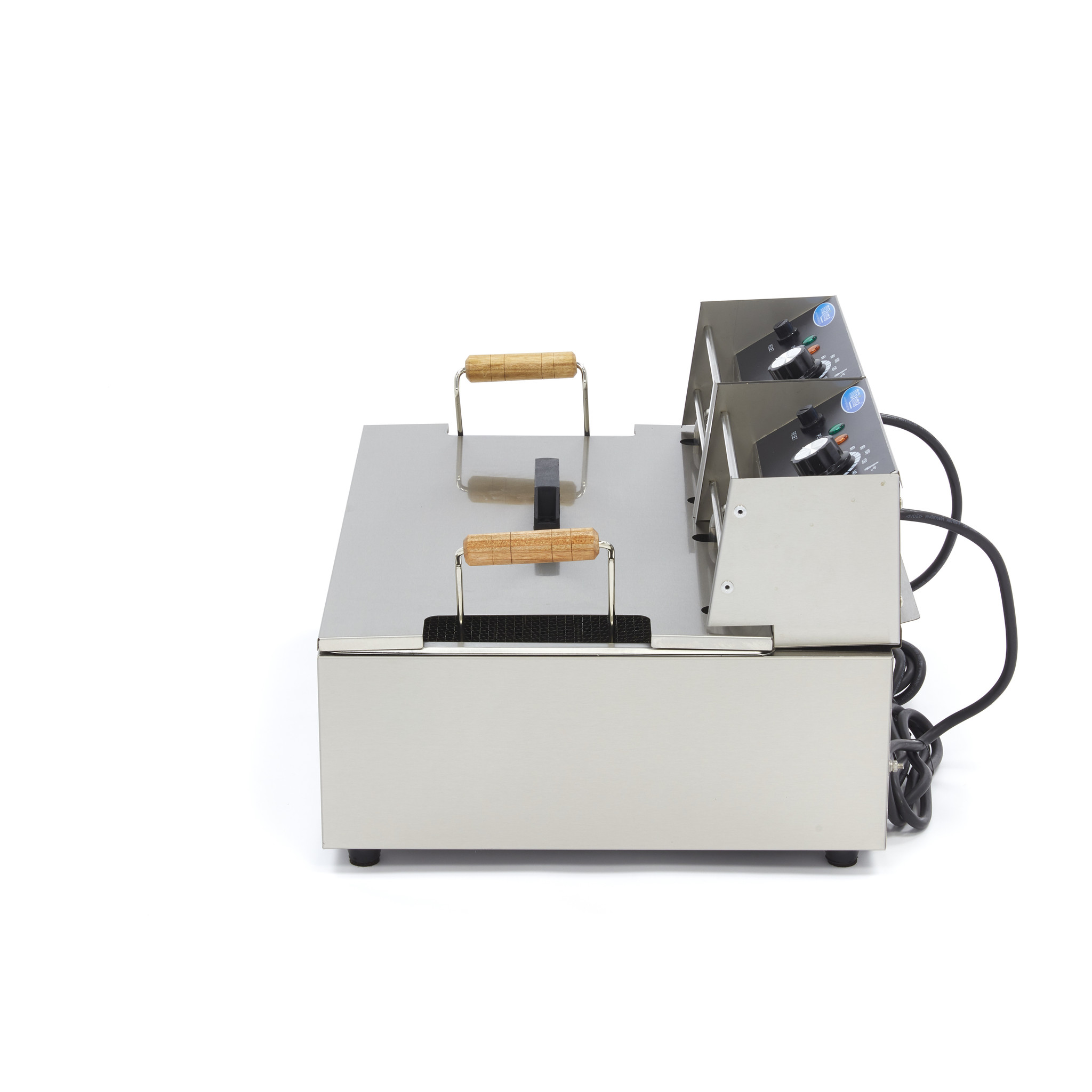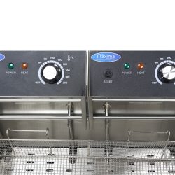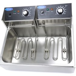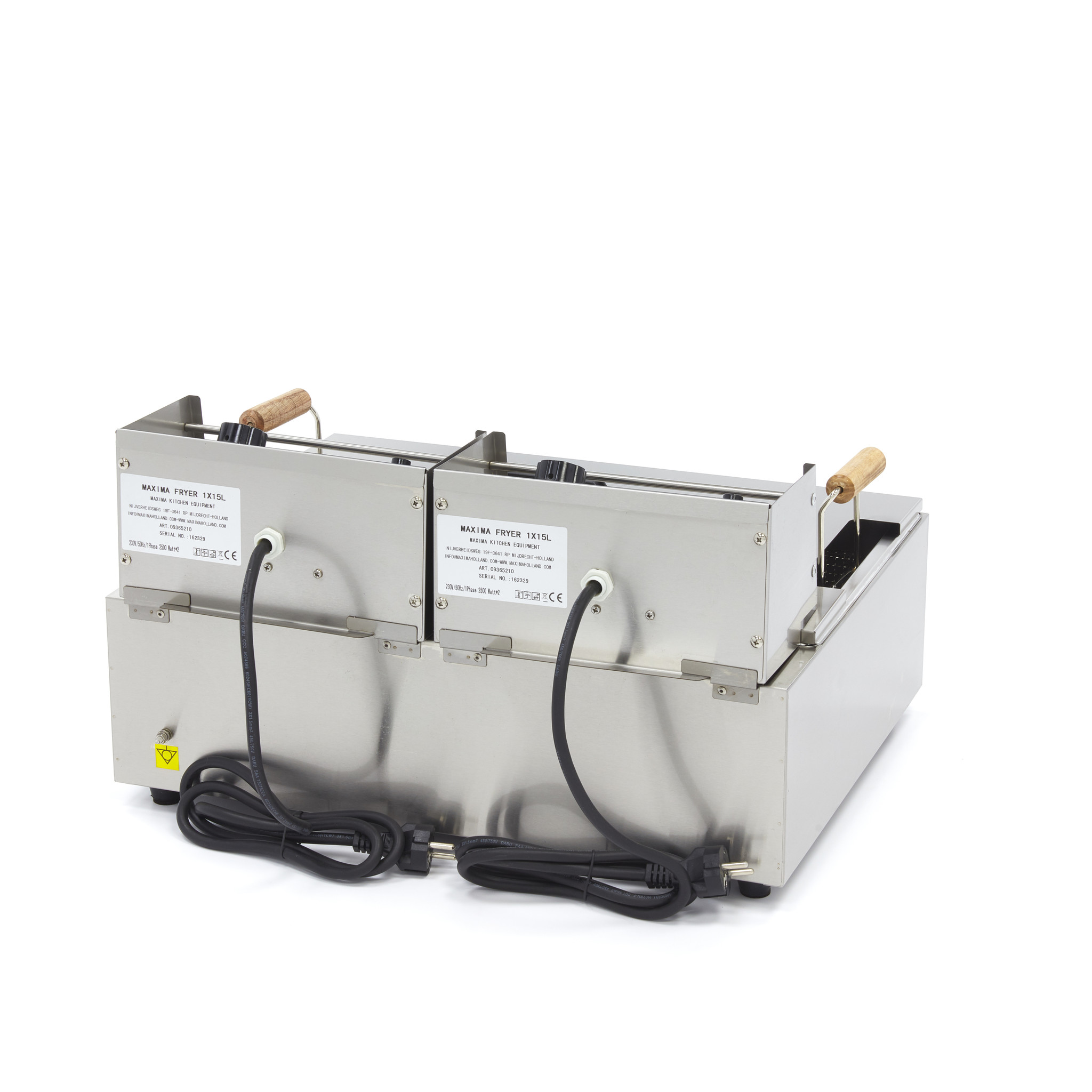 Om du regelbundet friterar stora mängder mat i din cateringanläggning är denna professionella 15-liters fritös idealisk. Den består av två separata värmeelement och en stor fritöskorg. Fördelen med en fritös med två värmeelement är att du inte behöver mycket ström. Så oavsett vilken typ av kök du befinner dig i behöver du bara ansluta fritösen till ett vanligt eluttag. Du kan använda de värmebeständiga handtagen när du lyfter fritösen för att förhindra skador, och det medföljande locket förhindrar att olja stänker under användning. Gummifötterna längst ner på apparaten säkerställer dess stabilitet och fasthet på de flesta ytor.