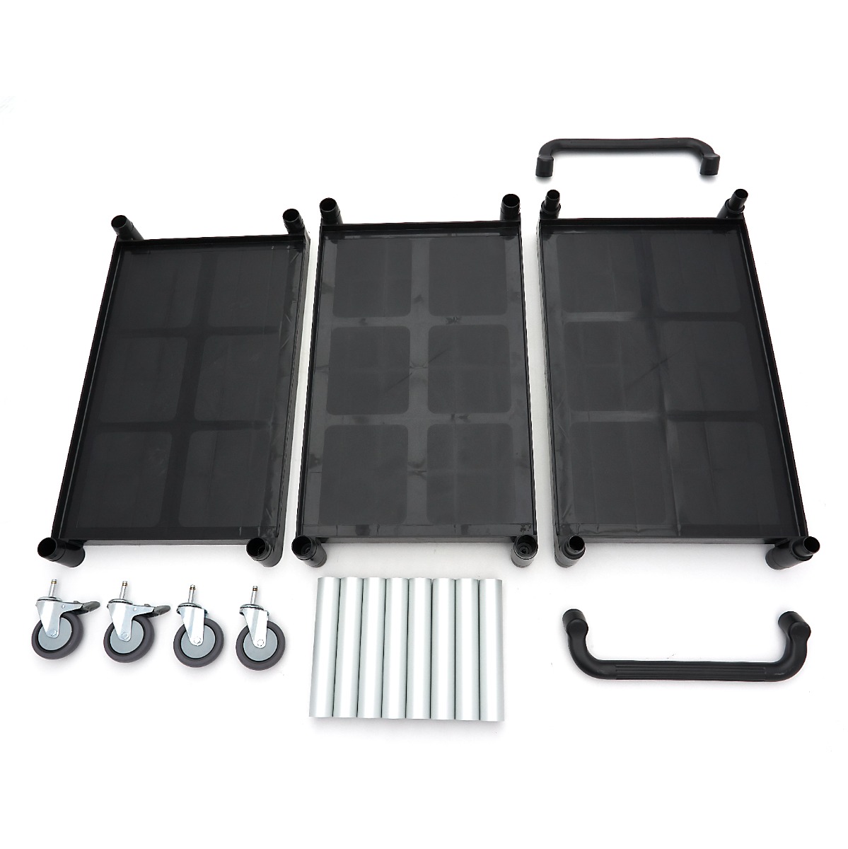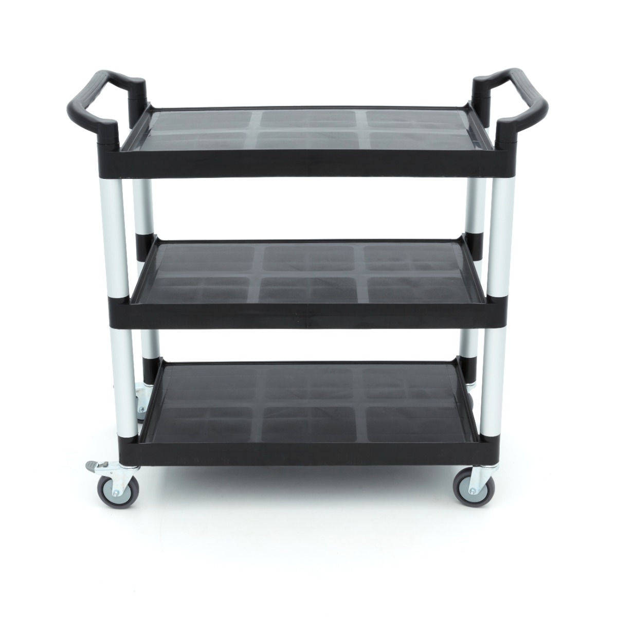 Serveringsvagnen är tillverkad av aluminium och klarar daglig användning. Serveringsvagnens tre plasthyllor är förstärkta i hörnen och tål en maximal belastning på 50 kg per hyllplan. Hyllorna har en upphöjd kant så att disk inte kan ramla av dem. För smidig förflyttning är serveringsvagnen utrustad med fyra praktiska hjul, varav två har bromsar. Det betyder att du enkelt kan placera serveringsvagnen var som helst utan att den rullar iväg.