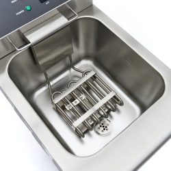 Ця фритюрниця відрізняється від більшості великих моделей тим, що працює від напруги 230 В, тому немає потреби в додатковому джерелі живлення. Вона виготовлена з міцної нержавіючої сталі та має практичну основу для зберігання таких предметів, як каністри з олією для смаження. Внизу є зливний кран, оснащений фільтром, який дозволяє легко та ефективно видаляти стару олію, гарантуючи, що крихти та залишки не стікатимуть разом з нею. Фритюрниця також оснащена холодною зоною, яка запобігає пригоранню частинок їжі, тим самим зберігаючи якість олії для смаження. Вона оснащена кошиком для смаження з нержавіючої сталі, захисною кришкою, захистом від перегріву та захисним вимикачем, розташованим під нагрівальним елементом.