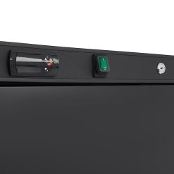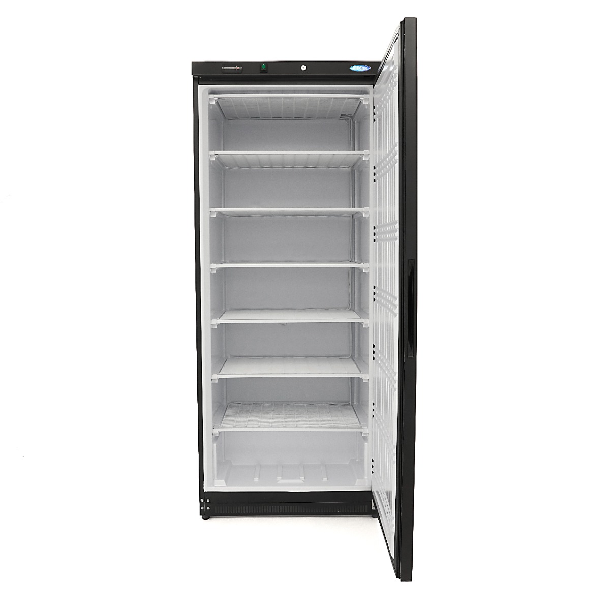 Ця професійна морозильна камера має загальний об'єм 600 літрів, у якому ви можете зберігати заморожені продукти. Завдяки компактним розмірам, ця чорна морозильна камера підійде майже для будь-якої професійної кухні. Шість полиць забезпечують більш ніж достатньо місця для зберігання необхідного. Полиці міцні та мають сітку для кращої вентиляції. Дверцята оснащені замком для додаткової зручності.
